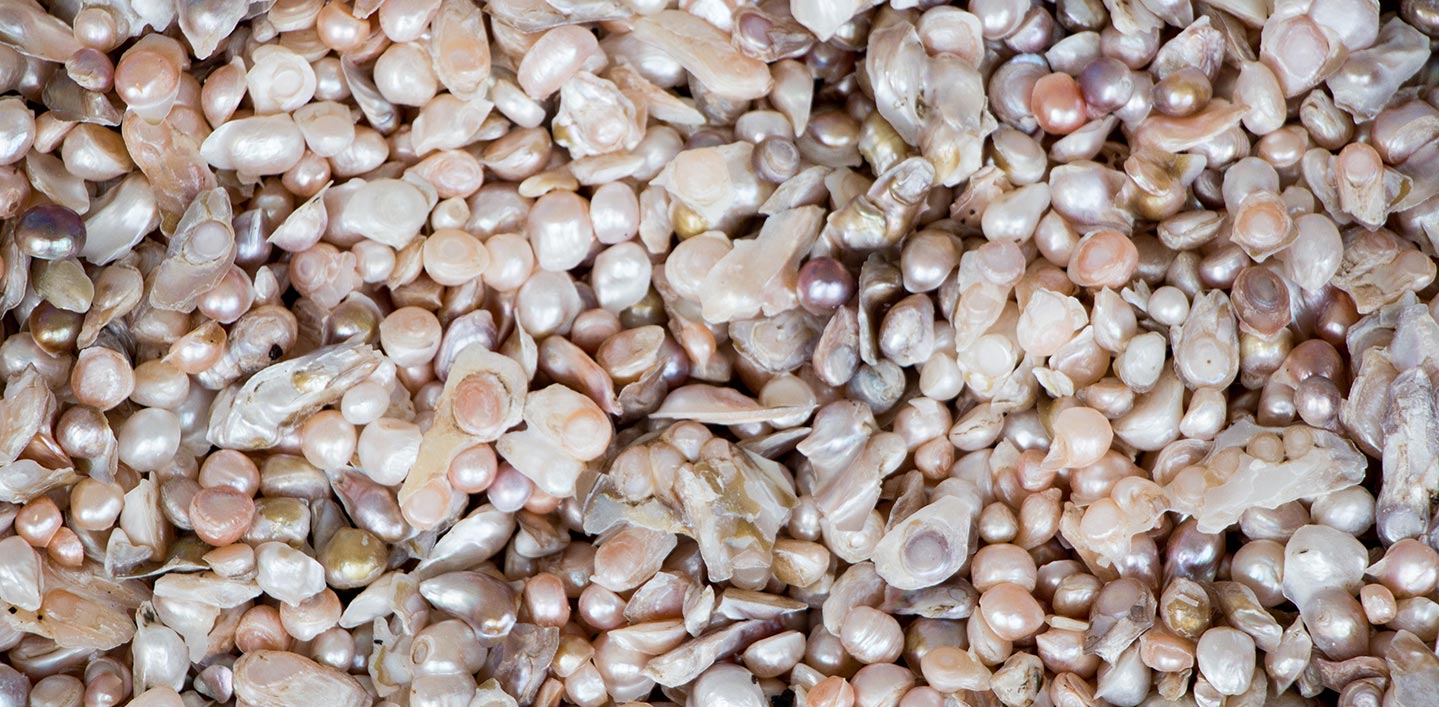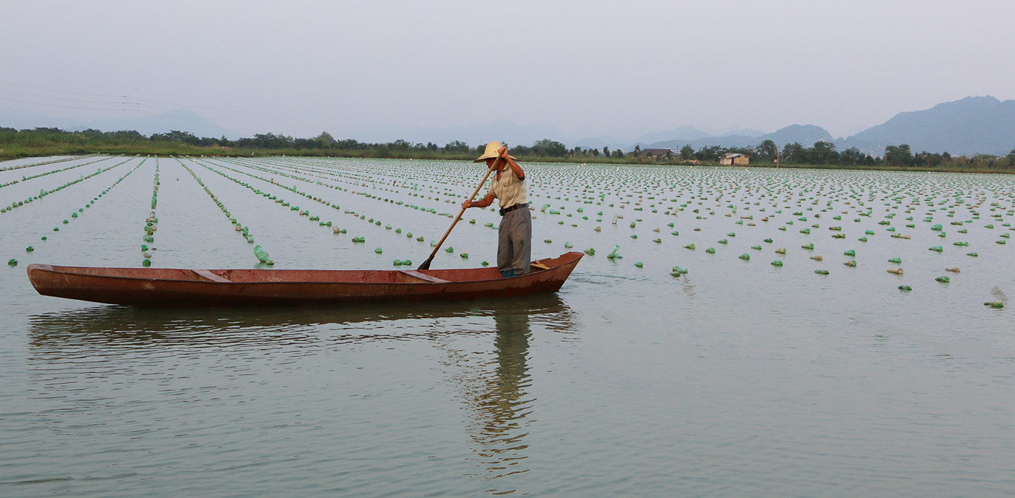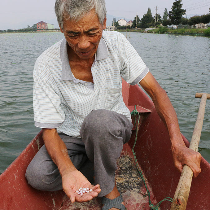 To find the best pearls, we traveled to an ancient Chinese village where pearl farming is a high art. Farmers like Mr. Zhang respect the earth and recycle by using plastic bottles to tether the oysters.